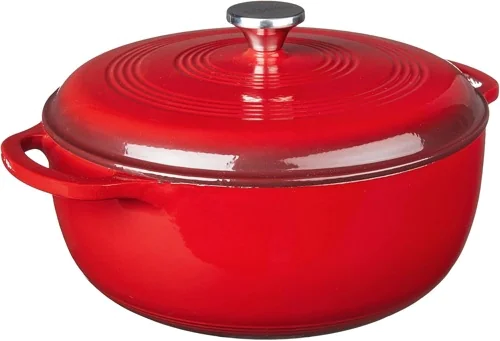 - Lodge 7.5 Quart Enameled Cast Iron Dutch Oven with Lid – I am no longer Team Cast Iron. I’m Team Enameled Cast Iron. I hate trying to keep the seasoning on a cast iron when I also like to use a lot of soap when cleaning. Our enameled cast iron dutch oven is used multiple times a week. It works on the stove. It sears. It simmers. It has high walls that hold a lot. It slides into the oven. It goes straight to the table. No PFAS from non-stick. This 7.5 qt size is the biggest Lodge makes, and allows me to make a double batch of recipes like soup and freeze the extra.