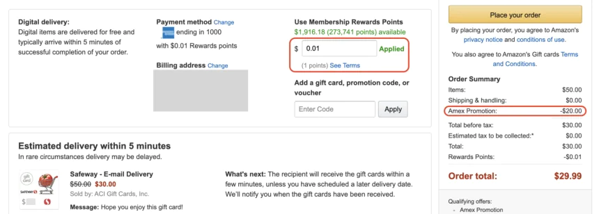 - You can buy third-party gift cards (Amazon Gift Card still doesn't work, and it seems Visa Gift Card doesn't work either). In short, just make sure to check the right side of the screen before placing your order to confirm that the Amex 40% off offer has been triggered.