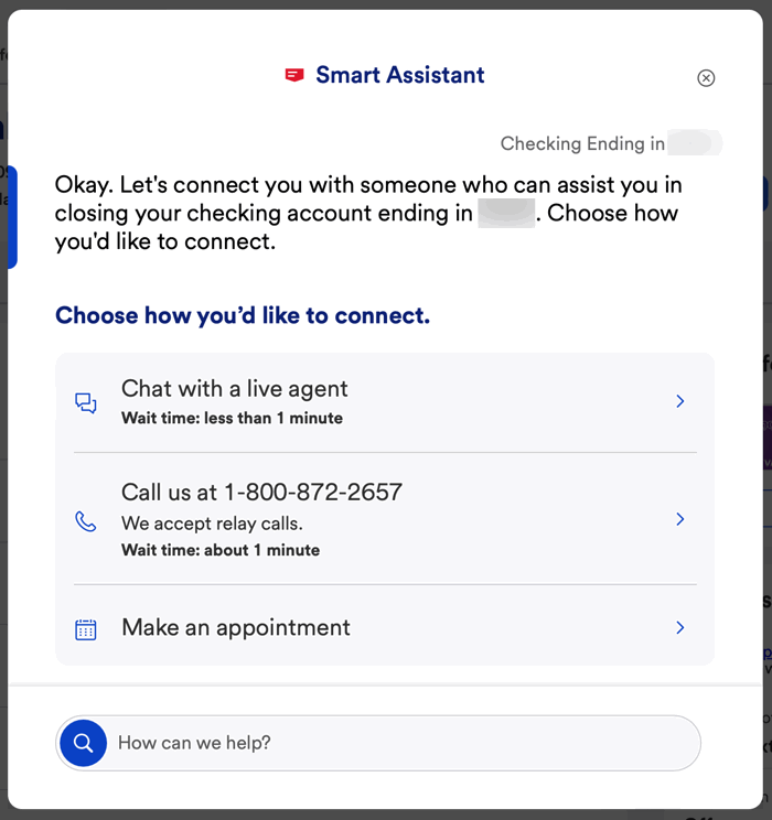 Once connected, specify whether you’re closing a checking account, savings account, or credit card. You’ll then see a confirmation popup outlining your choices and a short questionnaire. Depending on business hours, response times may vary, but in my experience, I was chatting with a human agent in under a minute. They handled everything while I continued working in another tab — no phone calls, no paperwork, just a clean online closure.