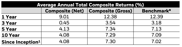 Net composite returns reflect the deduction of an annual fee of 3.00% typically deducted quarterly. Due to the compounding effect of these fees, annual net composite returns may be lower than stated gross returns less stated annual fee.