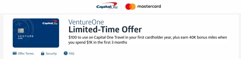 Get 40,000 bonus miles when signing up for the Capital One VentureOne card after spending $1,000 within three months. Plus, get $100 to use on Capital One Travel in your first cardholder year.