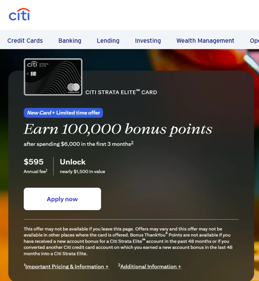 Citi Strata Elite is offering 100,000 points after $6,000 in spend
