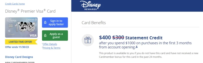 Disney Premier Credit Card from Chase $400 Cash Signup Bonus