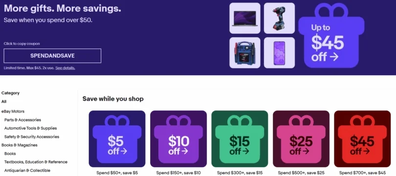 - eBay is offering up to $45 off select items with promo code SPENDANDSAVE. Tiers are as follows: