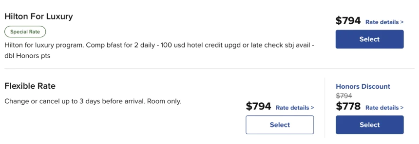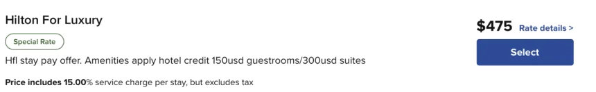 Both base prices correspond to the Flexible Rate (HFL), so the prices are the same. Therefore, in most cases, the Aspire card package cannot compare to Hilton for Luxury (HFL) benefits. However, it's not entirely inferior. As mentioned earlier, in a few hotels, the HFL price may have restrictions on the minimum number of nights or room type (for example, Conrad LAS requires 3 nights, or Conrad Beijing only offers HFL rates for Executive Rooms and above). When the HFL price is unavailable, you can consider using ZZAAP1 instead to get a $100 credit.
