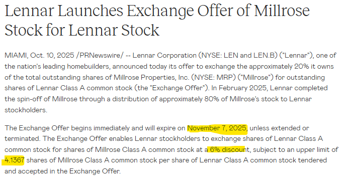 On October 10, 2025, Lennar formally announced that it would spin off its remaining ~20% stake in Millrose Properties via an exchange offer.
