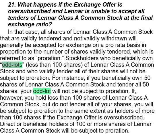 In terms of timing, the exchange offer expires on November 7, 2025 (unless LEN changes it), and so I recommend that you buy LEN shares no later than November 3rd to ensure you make the deadline (it takes two trading days for your purchase to settle and brokers internal deadlines are usually 2 days prior to the official company deadline). After you purchase shares, call your broker and ask them to tender your shares. This is important. Your participation in the exchange isn’t automatic.