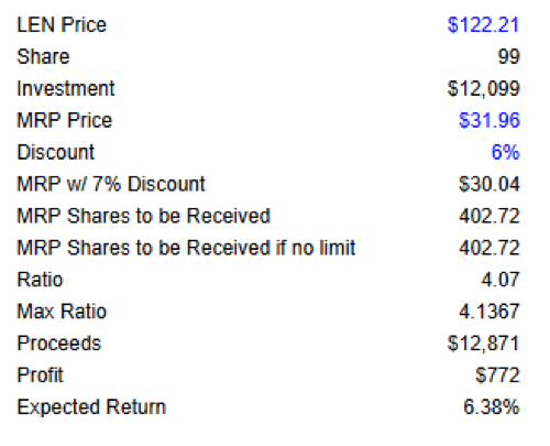 Per the exchange offer, shareholders who elect to exchange their LEN shares will receive MRP shares at a 6% discount or at a price of $30.04 ($31.96 x (1-6%)). The MRP price hasn’t been finalized yet. But I’m using the current price plus the discount as I think that’s the best way to approximate what the actual price will be. The actual price will be determined by a formula laid out here.