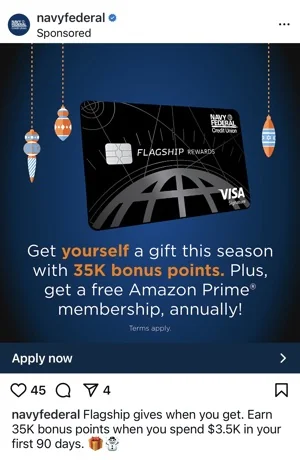 Navy Federal Flagship Rewards: 35,000-Point Bonus + Annual Amazon Prime Included
