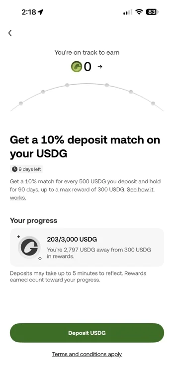 Note: Before you deposit any cash, opt into the deposit match bonus first so you can “double dip” if you plan on buying USDG (the conservative approach).
