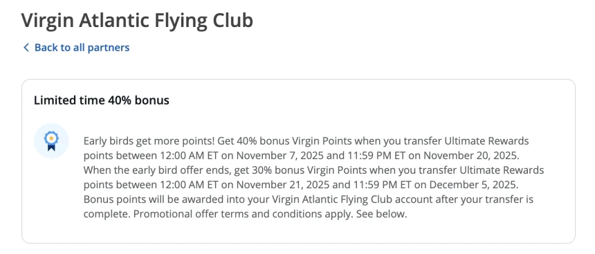 From November 7th to November 20th, there's a 40% bonus when transferring Chase UR points to Virgin Atlantic Flying Club (VS). No registration is required, and there's no limit. VS transfer bonuses are common, mostly around 30%, so this 40% bonus is quite high. If you have an immediate need, transfer as needed; it's not recommended to hoard too many.