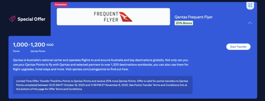 From October 19th to November 8th at 11:59 pm EST, Citi TYP transfers to Qantas Frequent Flyer will receive a 20% bonus. No registration required, no limit.