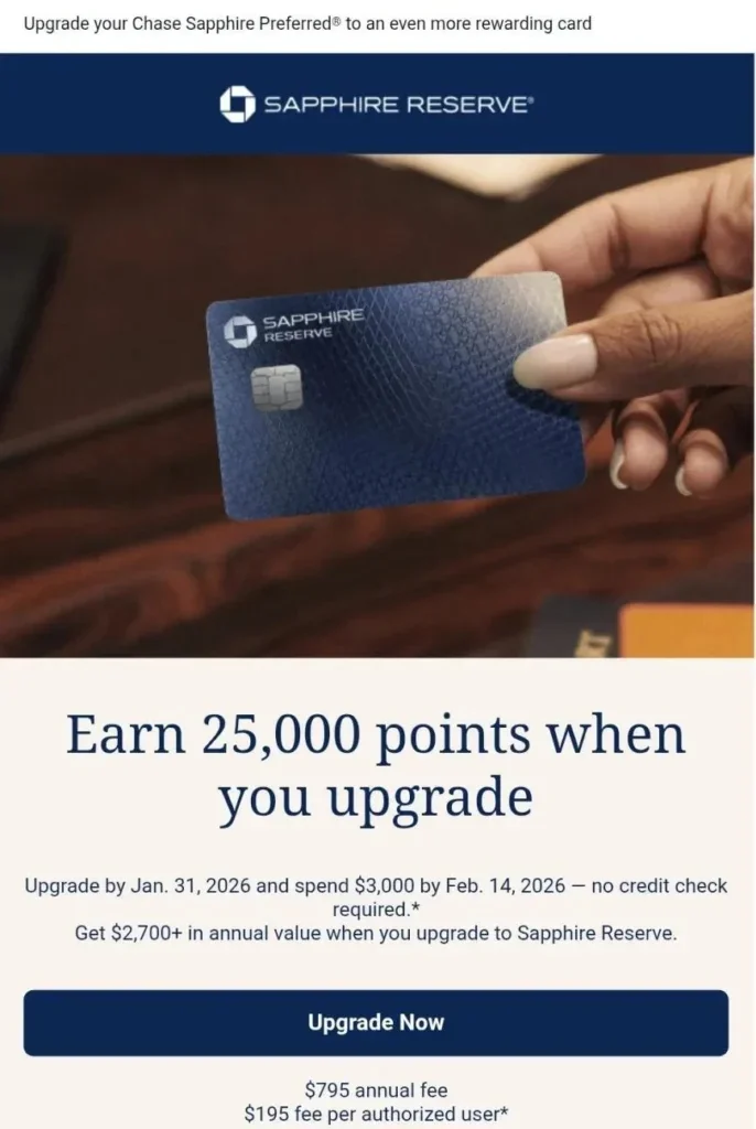 - Chase is sending out an email offer to some Sapphire Preferred cardholders to get a 25,000 points bonus when you upgrade to the Sapphire Reserve by 1/31/26. Must spend $3,000 by 2/14/26 to get the bonus.