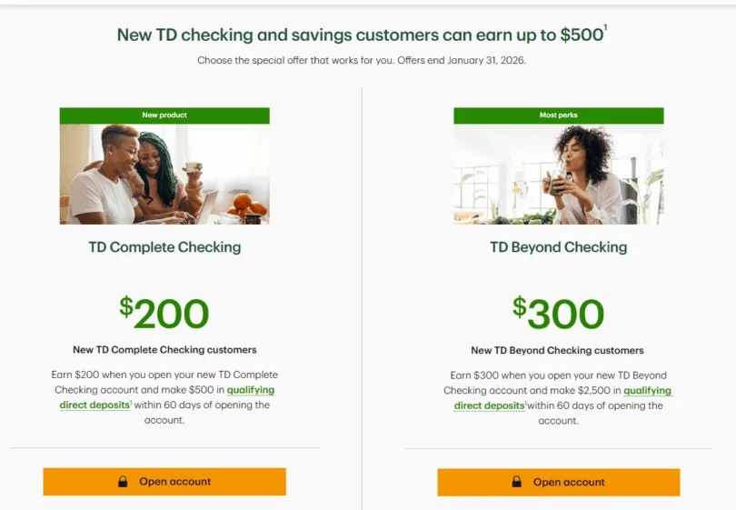 - Open TD Complete Checking account and make $500 in direct deposits within the first 90 days