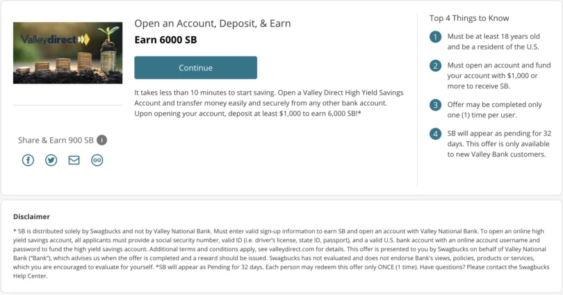 - Swagbucks is now offering a tiered bonus of up to 14,000 Swagbucks (worth $140) when you open a new ValleyDirect account. Broken down as follows: