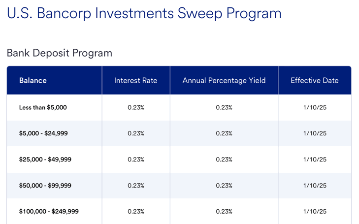 Notably, as with many brokerage firms, US Bank pays rather pathetic rates on idle cash (0.23% APY as of 5/15/25). The cash sweep that we forget about is a reliable profit source for them. I tend to forget, everyone tends to forget.