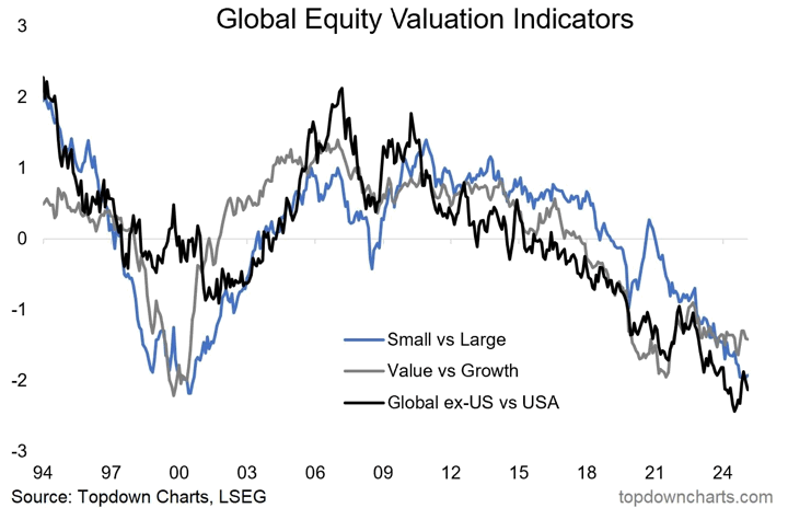 This chart shows the relative valuation trends (US over ex-US, Growth over Value, and Large-cap over Small-cap stocks):