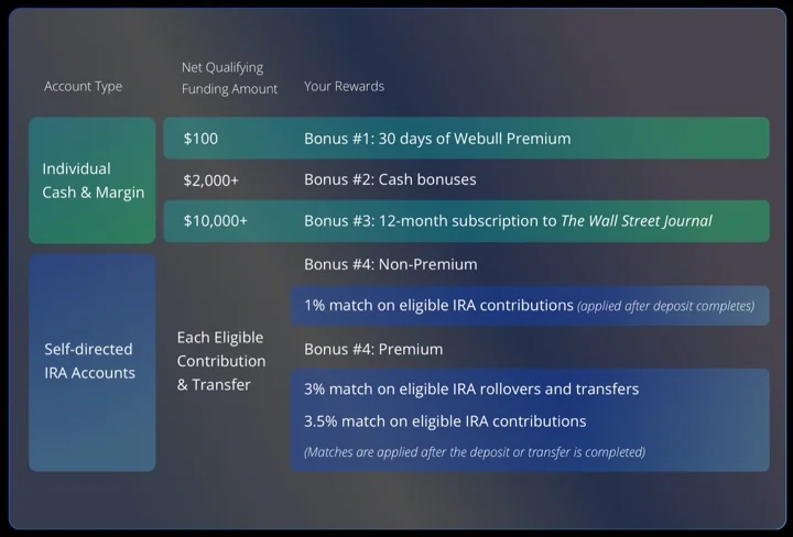 Webull Brokerage Promotions 2025: Deposit Bonuses, Free WSJ Subscription, and 3.5% IRA Match with Premium