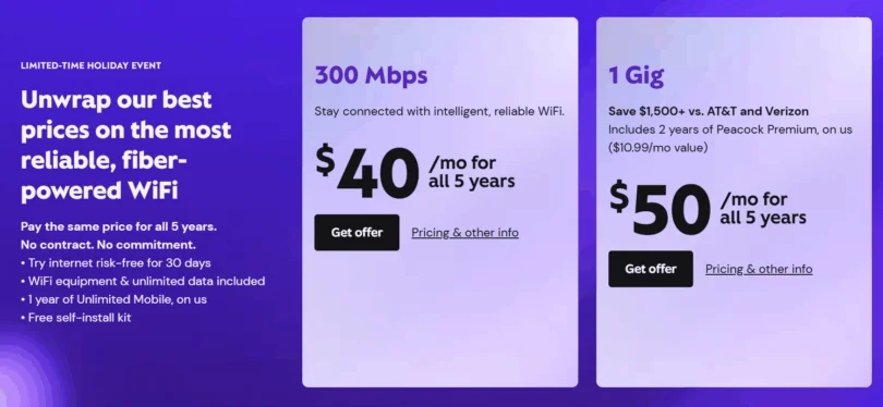 - Xfinity is offering new customers 1 Gig Fiber Internet (5-Year Price Lock) + 2-Year Peacock Premium Subscription + 1-Year of Unlimited Mobile Phone Service for $50 per month